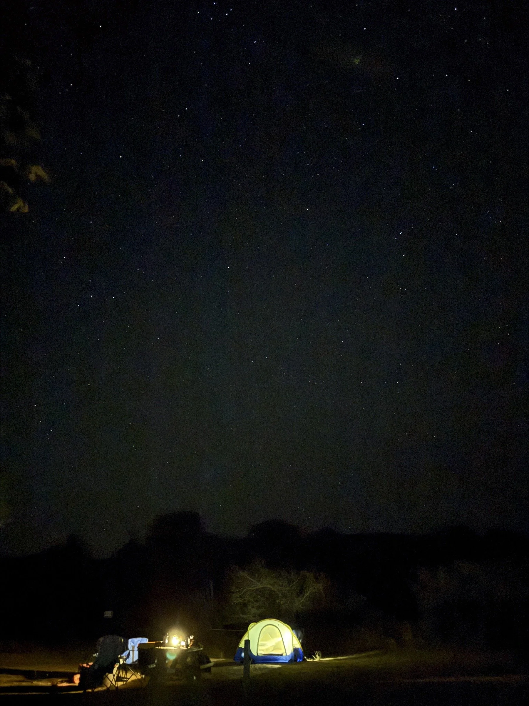 I had work on Friday, so we started driving a little after 5 p.m. We stopped for dinner on the way down, so we arrived a little after 8 p.m. when it was completely dark. With our headlamps on, we walked to our campsite, got our tent up, and prepared our sleeping quarters. Then we sat on the picnic bench, looked up at the sky, and admired the stars while snacking on spicy peanuts and Fishnacks. We retired to our tent around 10 p.m., but we stayed up for a while—I read while Cassie meditated inside, then at the picnic bench.