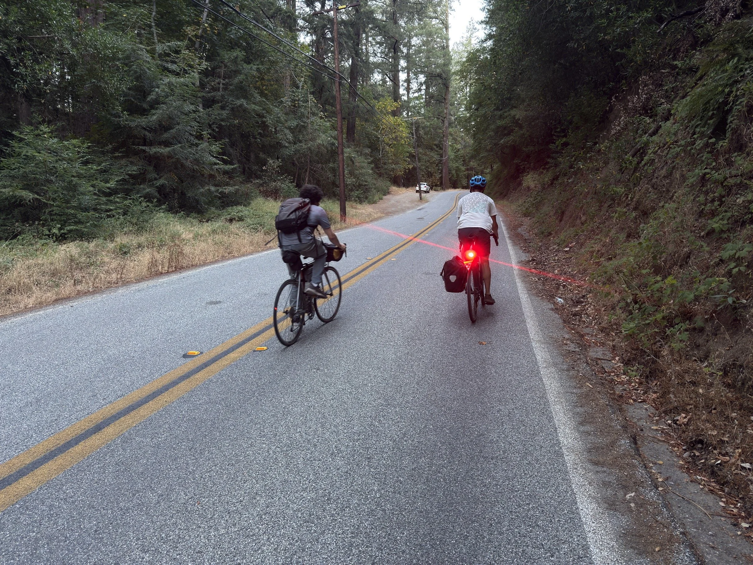 We initially tried to eat at the Big Basin Cafe, but when we tried to order sandwiches, we were informed that their grill closes an hour before the actual closing time (booooo). So we pivoted to our second choice, Anchors Fish and Chips. We had a great meal where Jo probably got the best bang for the buck with fish and chips, Cassie had some yummy fish tacos, Tommy carbo-loaded with a shrimp pomodoro, and I had the fancy grilled halibut. Satisfied, we rode up to Sanborn as a group—slowly but surely, we made it to our campsite right as the last bits of light faded away. And even before we could take our tents out, Ajay joined us at the campsite.