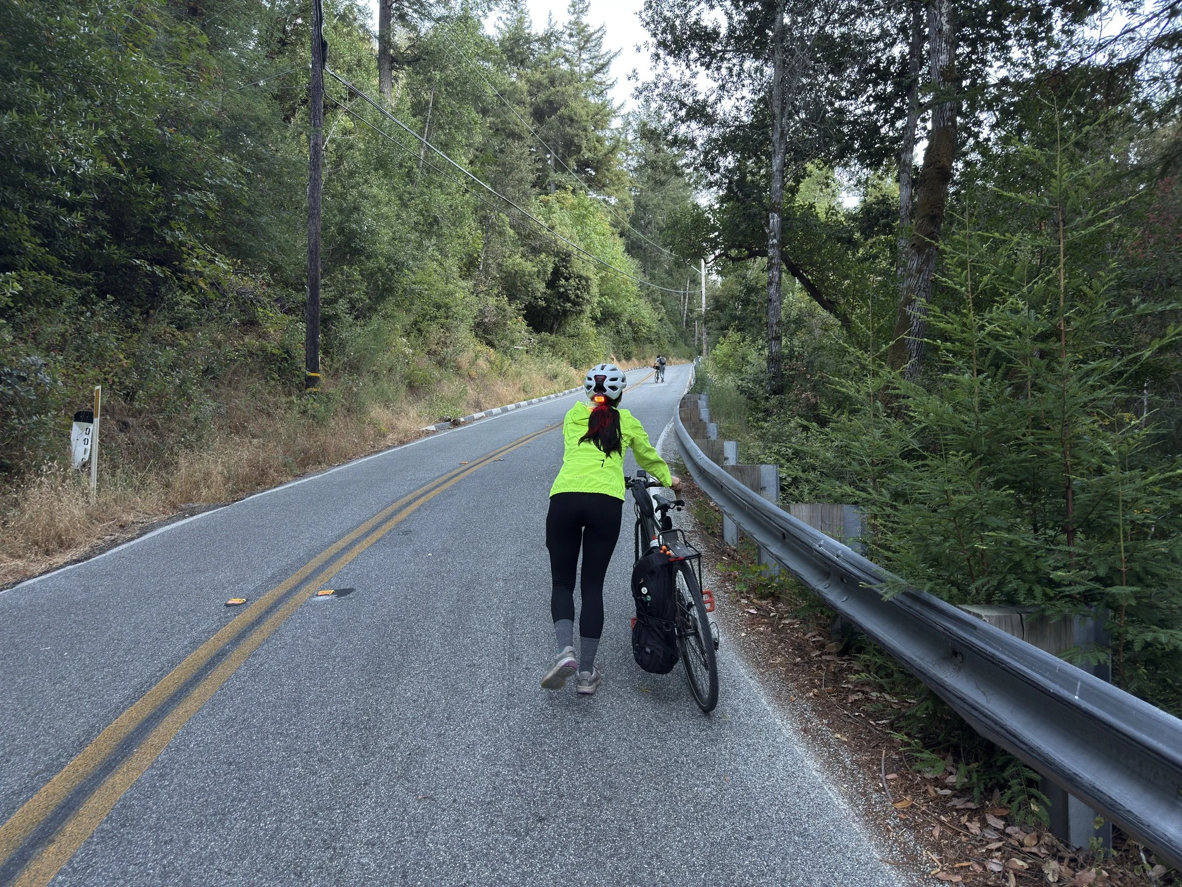 Sanborn Rd is one I had driven before, so I knew that it was hilly, but I had not remembered just how hilly it was—the grade was so steep that Cassie and I walked the majority of it. The big positive though is that it cuts through a redwood forest, so we were surrounded by the magnificent trees (and the always welcome blackberry bushes that provided us with berries to help power through).