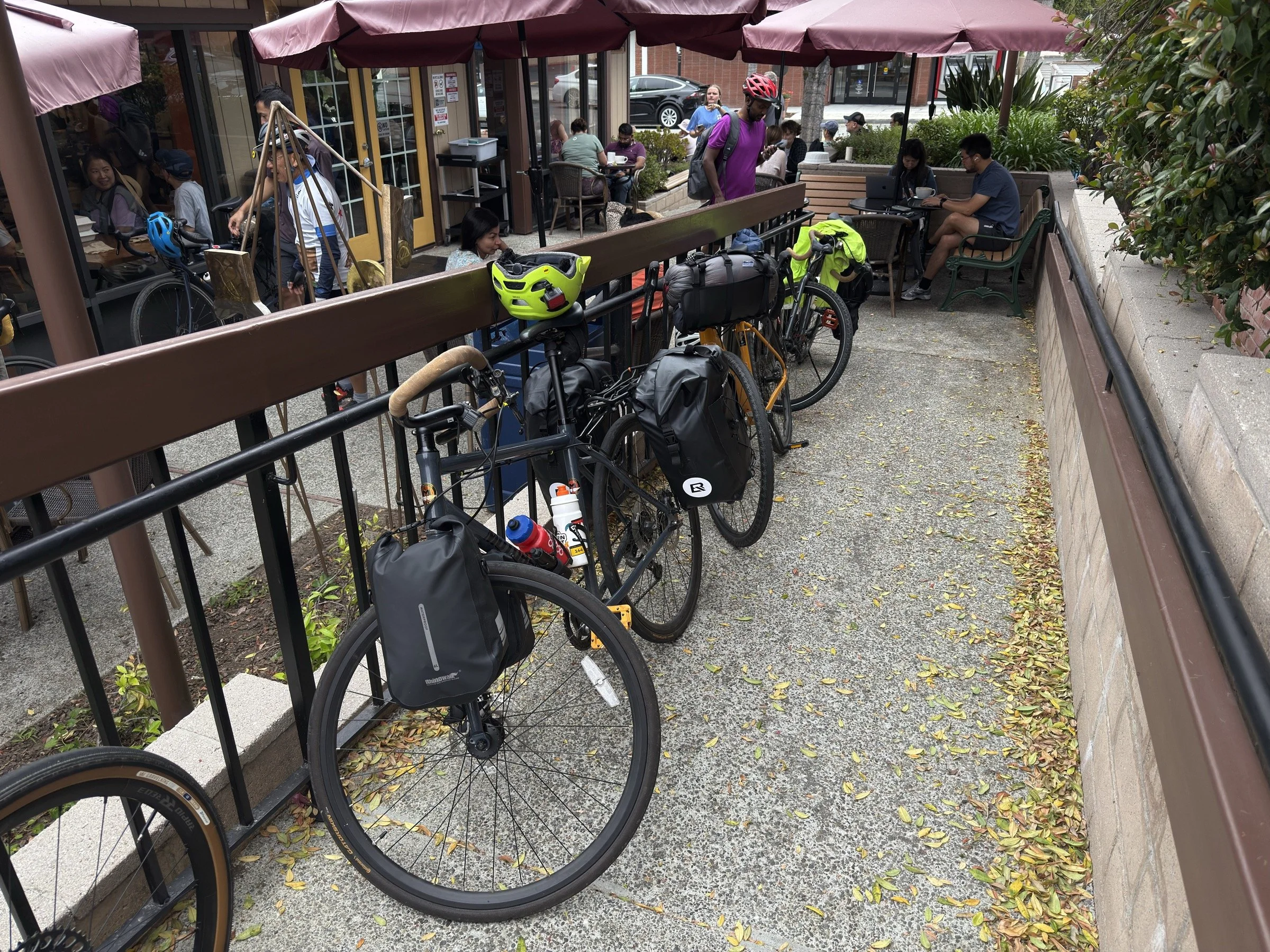 At the cafe, Jo had the avocado toast while the rest of us had the delicious breakfast burritos. We sat by the window and enjoyed the ever-continuing conversations. At one point a large cycling group came by and we checked out the different bikes and their drivetrains.