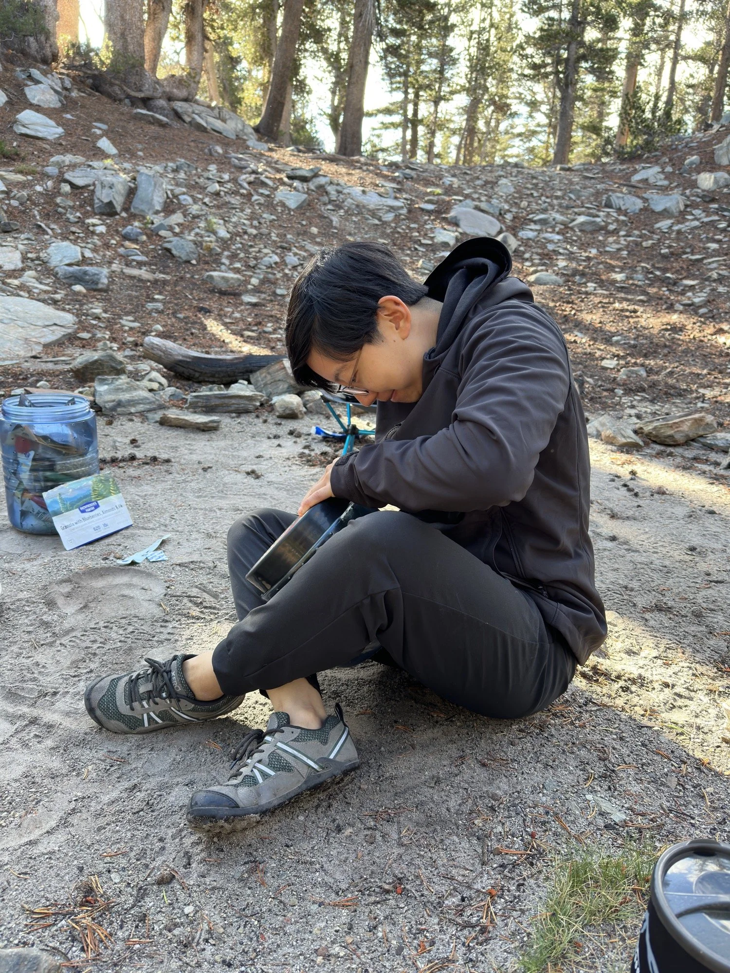 To be environmentally and budget conscious, we decided to carpool. I picked Louie up from Palo Alto right around 7am, then picked up Steve near Gene’s place around 8am, then drove straight to the Rush Creek trailhead by driving through Tioga Pass. The drive was a fun one with laughs and conversations about topics from religion to climbing. There were two moments that I remember vividly—one being Steve chuckling as Louie and I were geeking out at all the climbs and climbers we saw while driving through Tioga Pass; the second being Steve showing concern as I hobbled around Tioga Gas Mart as my ankle still wasn’t right after spraining it a few weeks ago while bouldering. With the second, I told Steve that the worst case scenario was that I would hike until I couldn’t take the pain, at which point, I would turn back and camp out in my truck until we met up on Sunday and I’d drive everyone back (thankfully, I didn’t have to abort, and we didn’t have to go to plan B).