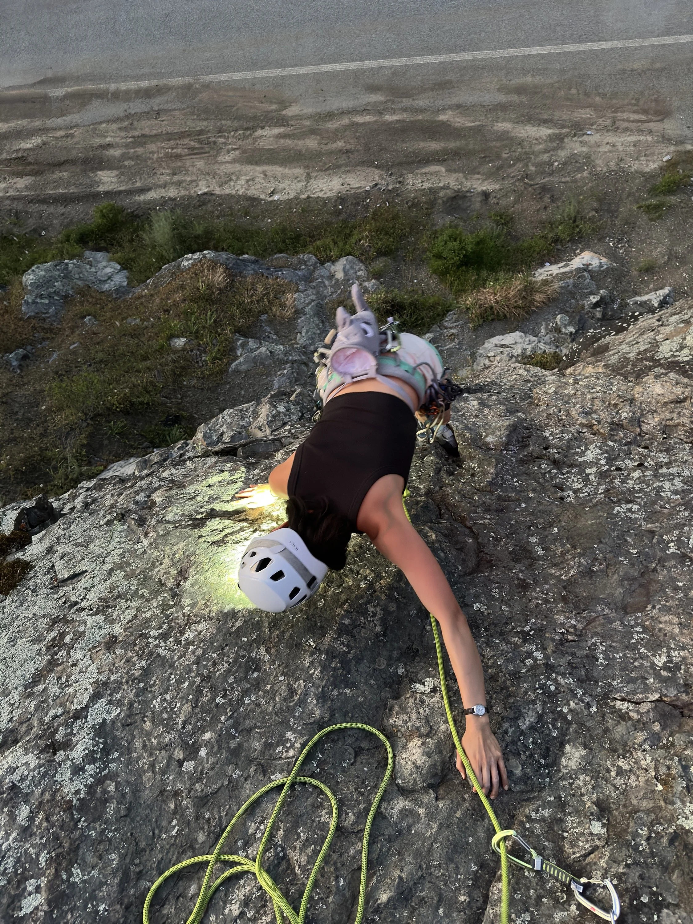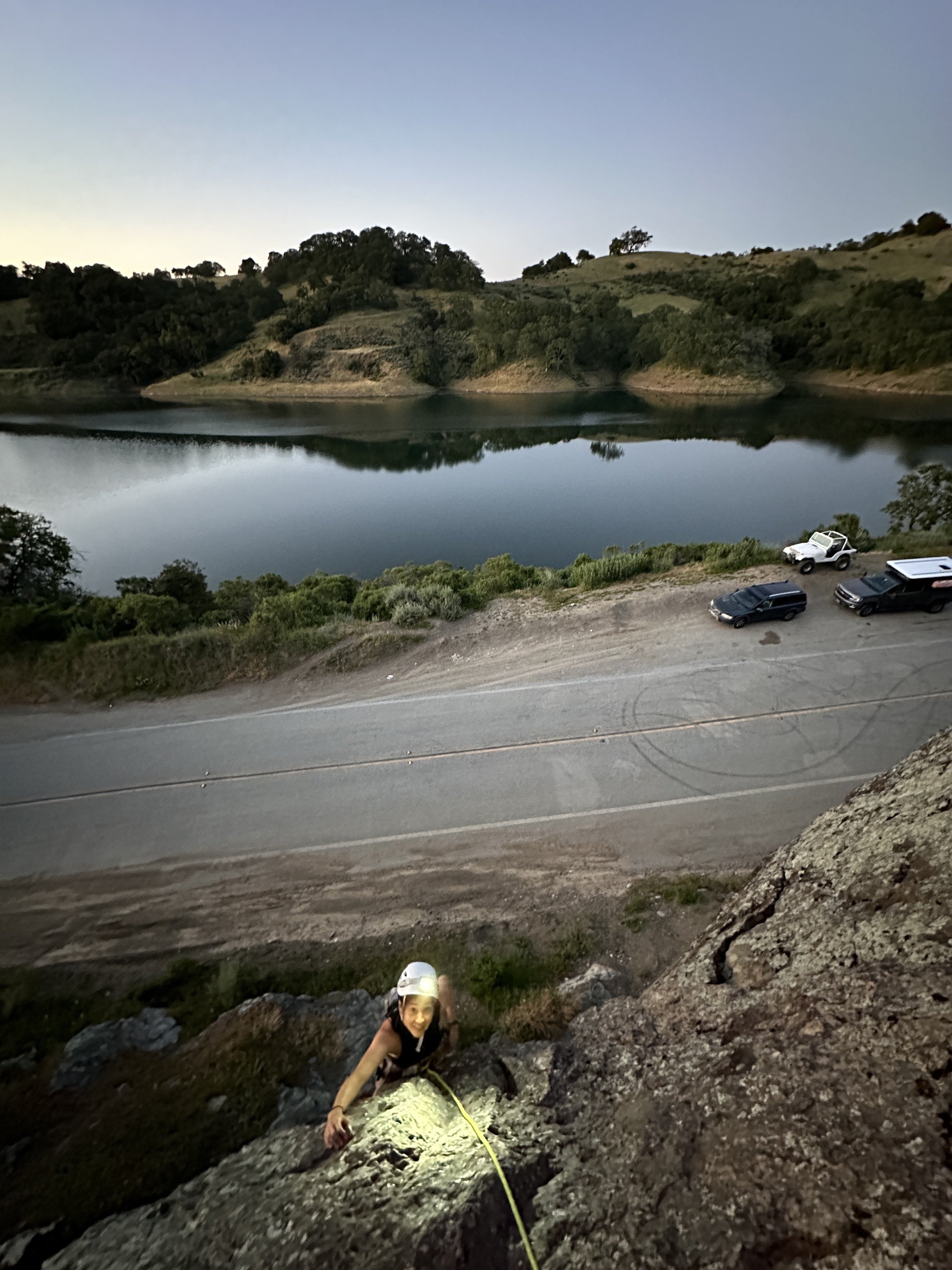Daddy’s BMW (5.7; Roadside Rock)—I led this route and again belayed from top. This time, I fixed the rope for a single-strand rappel and we rappelled using our grigris. Cassie made it down safely and I followed as the sun set and night encroached.