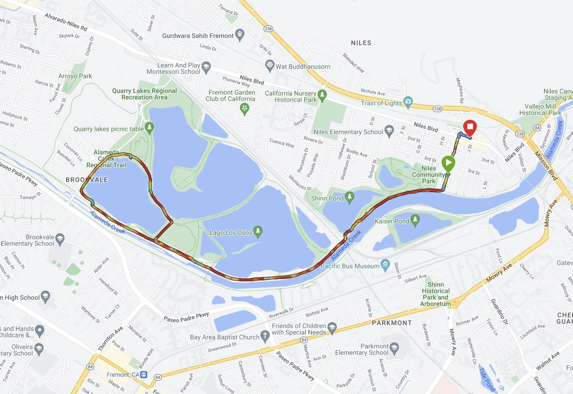 Once we reached the West end of Quarry Lakes Regional Park, we entered the park and enjoyed the views of the Quarry Lakes, before returning to the Alameda Creek Trail and cycling back to Niles for some ice cream.