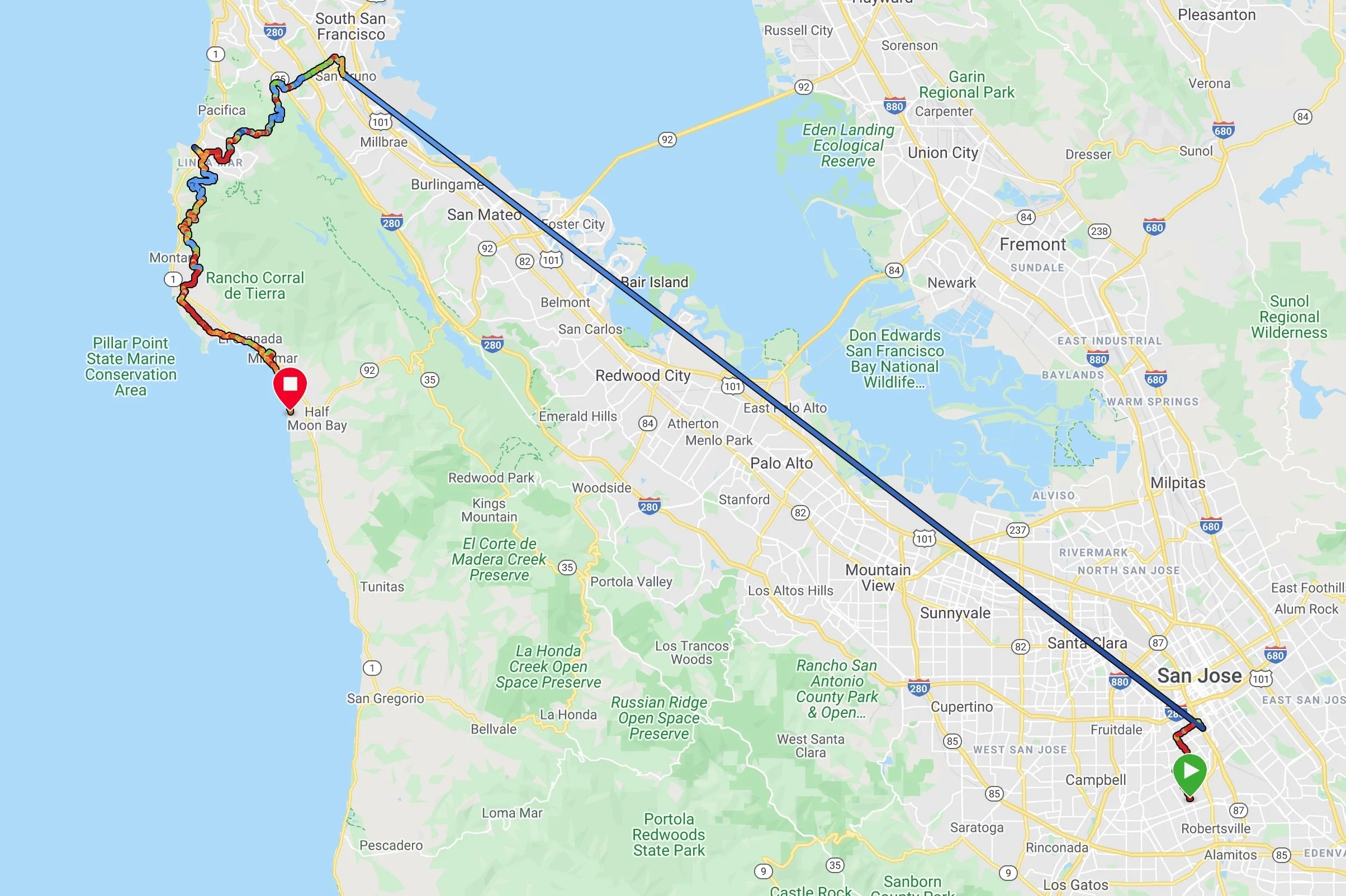 After that, I made my way over to Half Moon Bay, which required ascending a hill almost as big as the one that I had gotten over earlier in the day. But because the grade was gentler, I found it to be very enjoyable, without the pain that I found on Sweeney Ridge. Oh, one memorable portion was this feeling of peace that I had when I coasted while biking parallel to the runway on Half Moon Bay Airport—I had many doubts that I could even do this ride, but right there, I allowed myself the satisfaction of knowing that I had done it. I had bikepacked to my destination with a personal best elevation gain while carrying camping equipment.