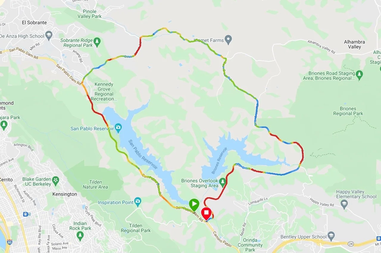 I started on the corner of Bear Creek Road and San Palo Dam Road and went clockwise. I felt that this was a great decision, given that the view of the San Pablo Reservoir on the northbound side of San Pablo Dam Road was great. The road itself had mild traffic and plenty of room for cyclists.