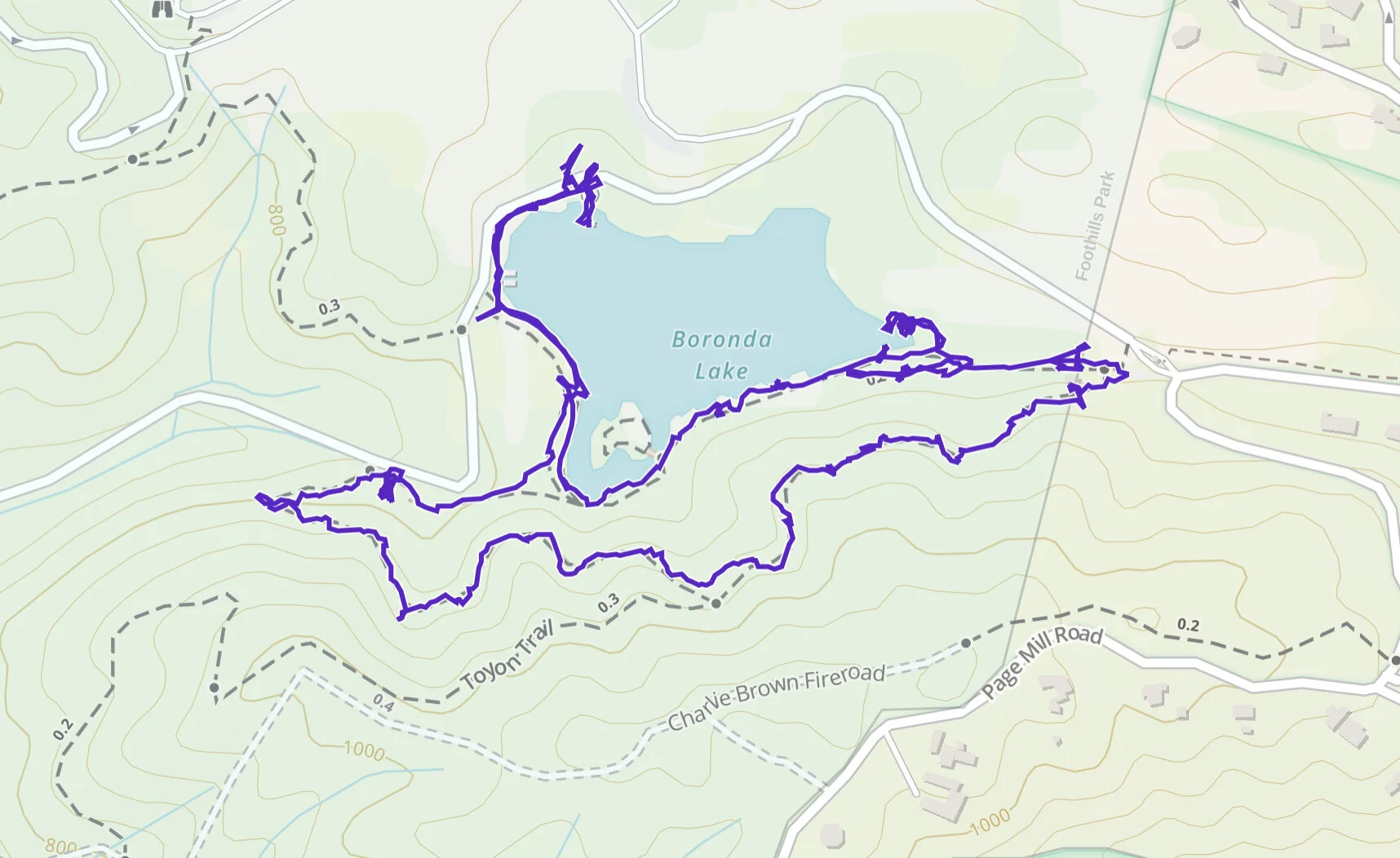 Toyon and Woodrat trails were mostly shaded, with the trail around the lake being less shaded.