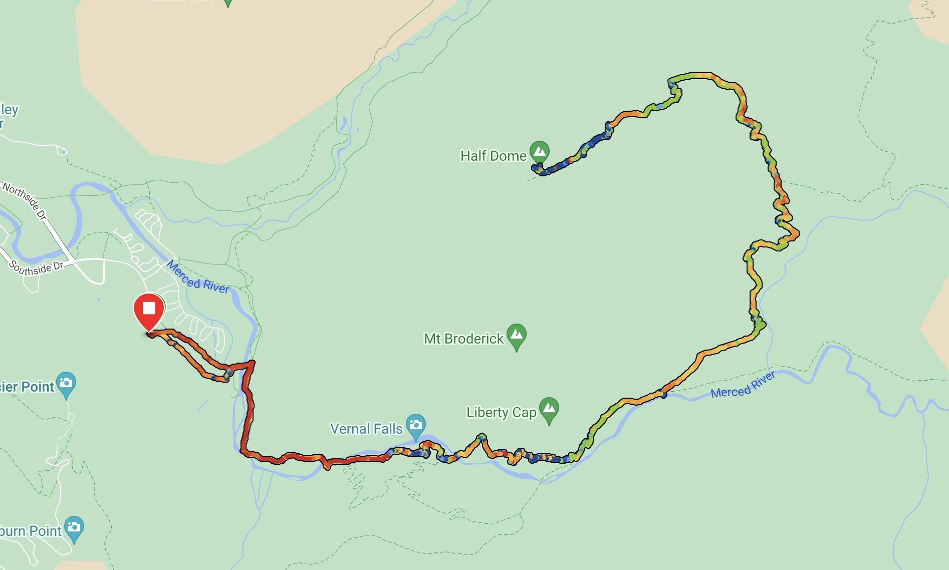 When I got near Nevada Falls, the number of people on the trail exploded, and I got a little frustrated at the amount of traffic on the trail. Maybe it was that, or just a burst of energy for other reasons, but I started running or skipping down the steep steps on the Mist Trail. It actually felt really good running with my backpack, and so, I now told myself that it would be pretty cool to hike this under 9 hrs from car to car. Once I got to the Mist Trail Trailhead, I knew that I could do it. I ended up completing the hike in 8 hrs and 53 mins!
