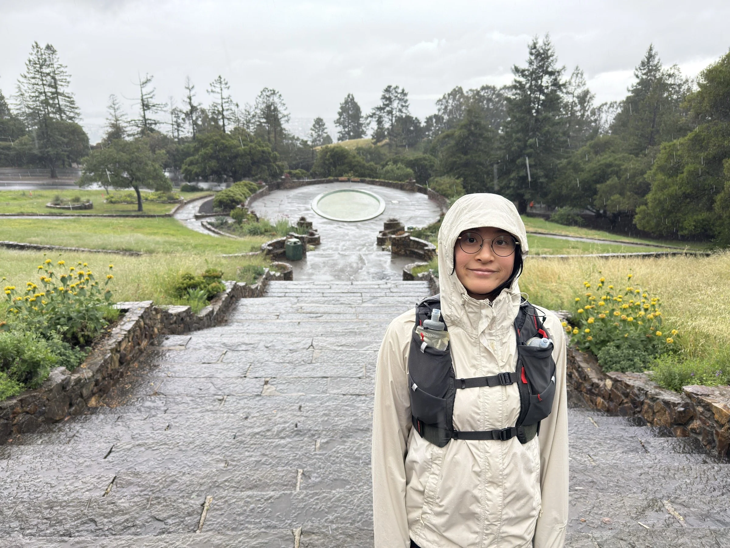 On a rainy day, we wanted a chill day to sleep in and take things easy, so we got to Joaquin Miller Park at 2 p.m. We started the hike dry, and even took off layers as we gained elevation on our route to the Chabot Space & Science Center. First, we admired the care that was put into building The Cascade, with the careful stonework that must have been required to create a cascade of waterfalls and the stone stairs. We then walked past the Woodminster Amphitheater, which we got curious about as we learned that it was built in 1941! There seems to be a company that runs several different plays all throughout the summer. We then started our hike in earnest and were surrounded wholly by trees. We heard the chatter of the forest as the trees swayed to the wind and warned us of the incoming storm.
