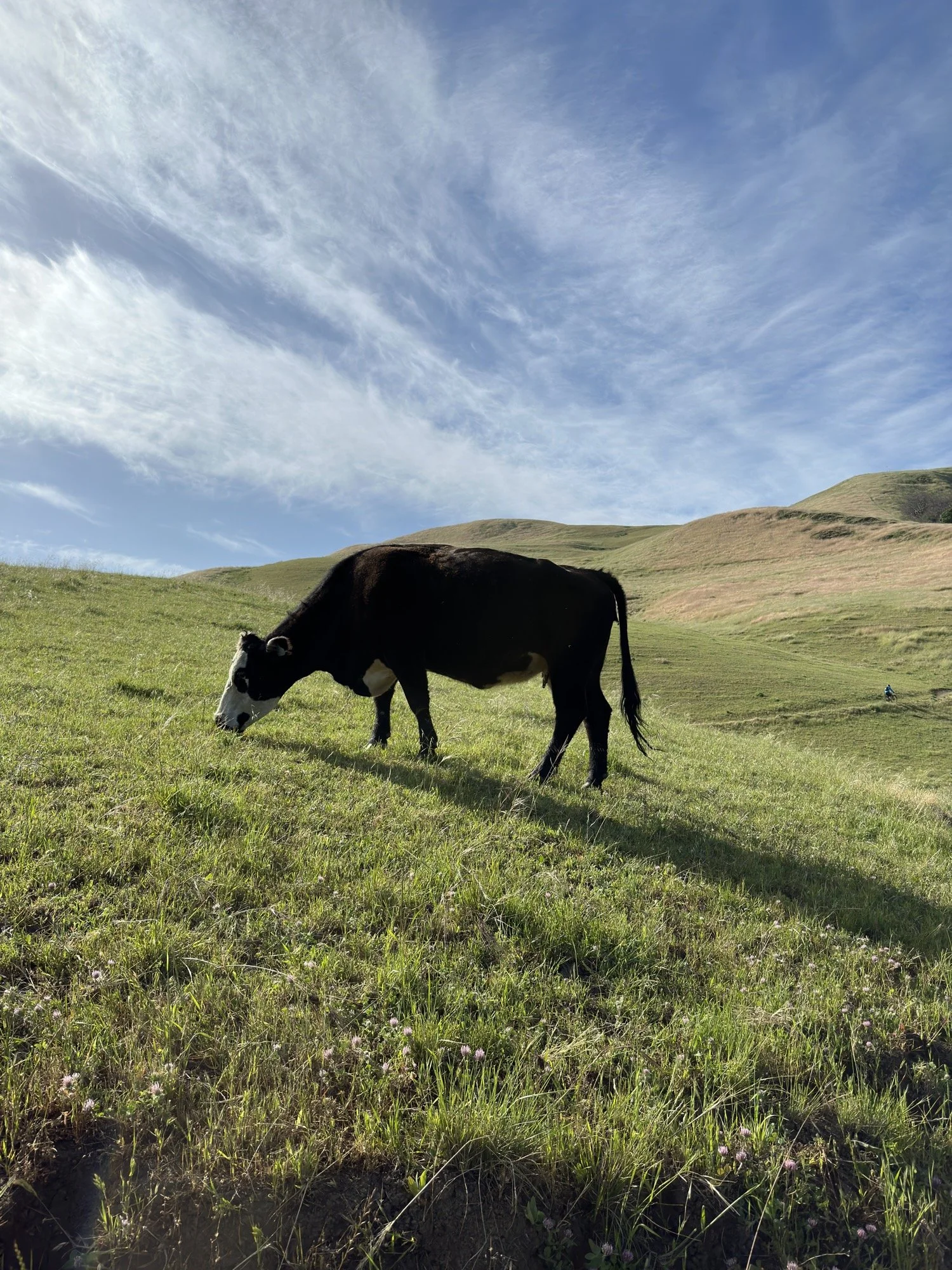 The Boccardo Loop Trail is a double track trail shared by bikers and hikers. It is dusty with lots of cows hanging out near or on the trail.