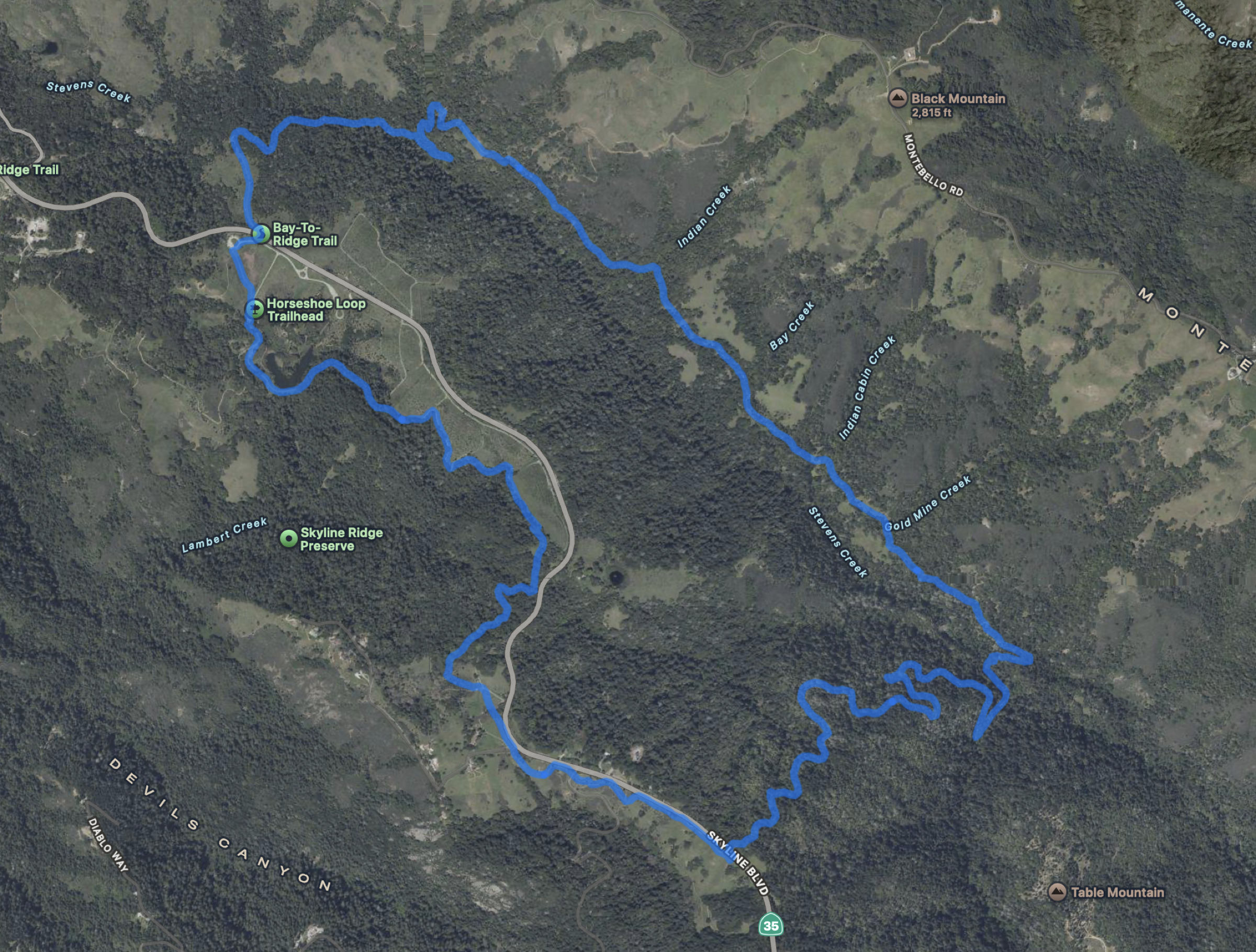 I hiked a good length of Stevens Creek by hiking a loop starting from the Skyline Ridge Parking Lot via Skid Road Trail, Canyon Trail, Grizzy Flat Trail, Peters Creek Trail, Chestnut Trail, Tree Farm Trail, and Sunny Jim Trail.